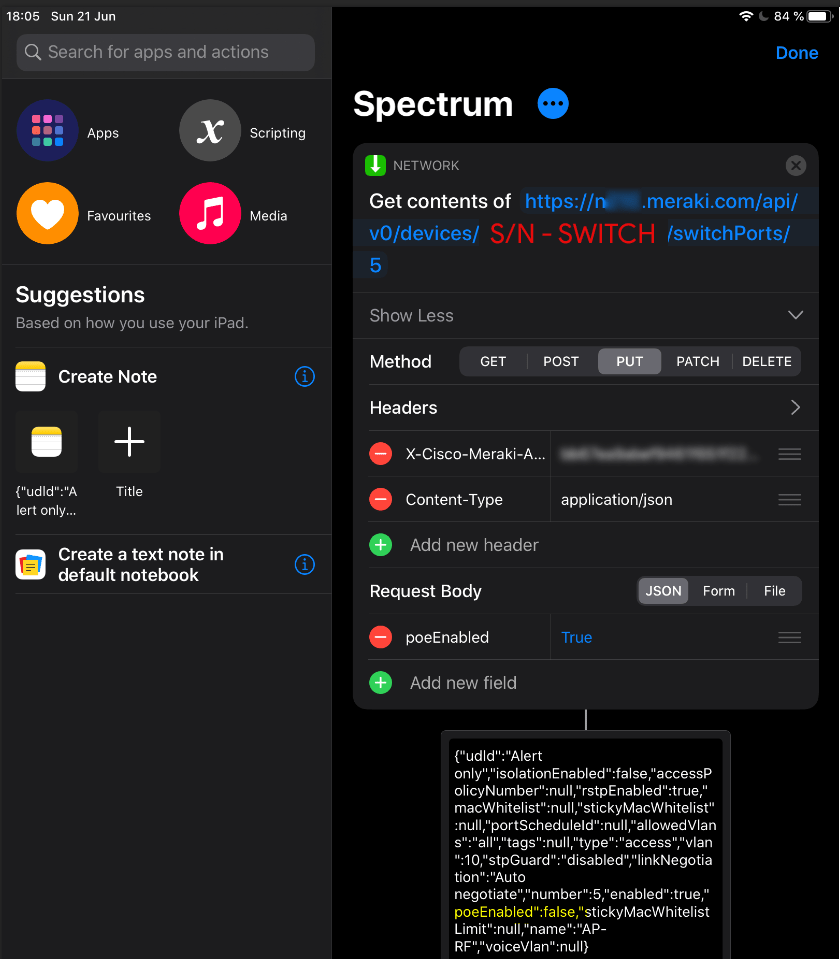 In short. After a few hours of playing around with Apple Shortcut, Postman and Meraki my mind expanded with ideas – this was completely new to me, and this will open up so many doors about automating really dump stuff, just how I like it.