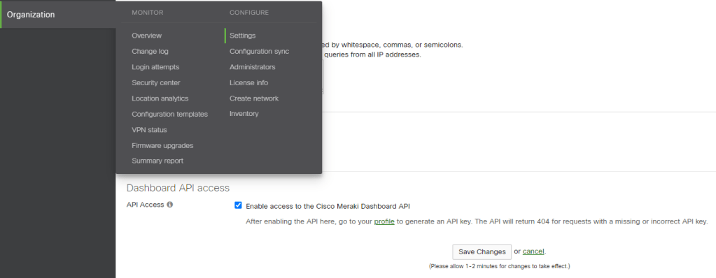 First off you need to enable access to the Cisco Meraki Dashboard API and generate an API key in your profile