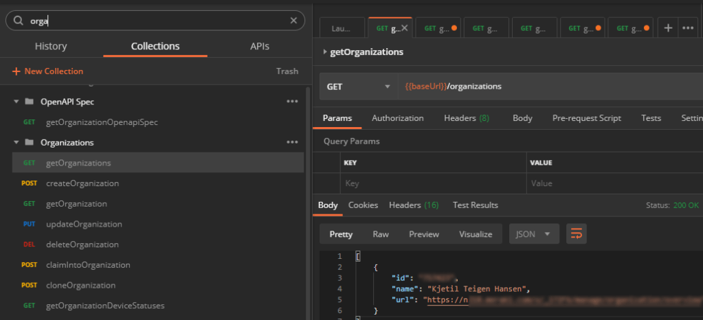 I installed Postman on Windows 10, and used this guide – Getting Started with Dashboard API and Postman to add the dashboard API Postman collection. This guide explains everything you need to get going, so I will not repeat it on this blog. I made my own environment called TGN Postman lab (TGN for TeiGeN that is) and added the API key and the baseUrl so you do not need to add this all the time when trying to GET something from your Meraki Dashboard or POST/PUT (change something).