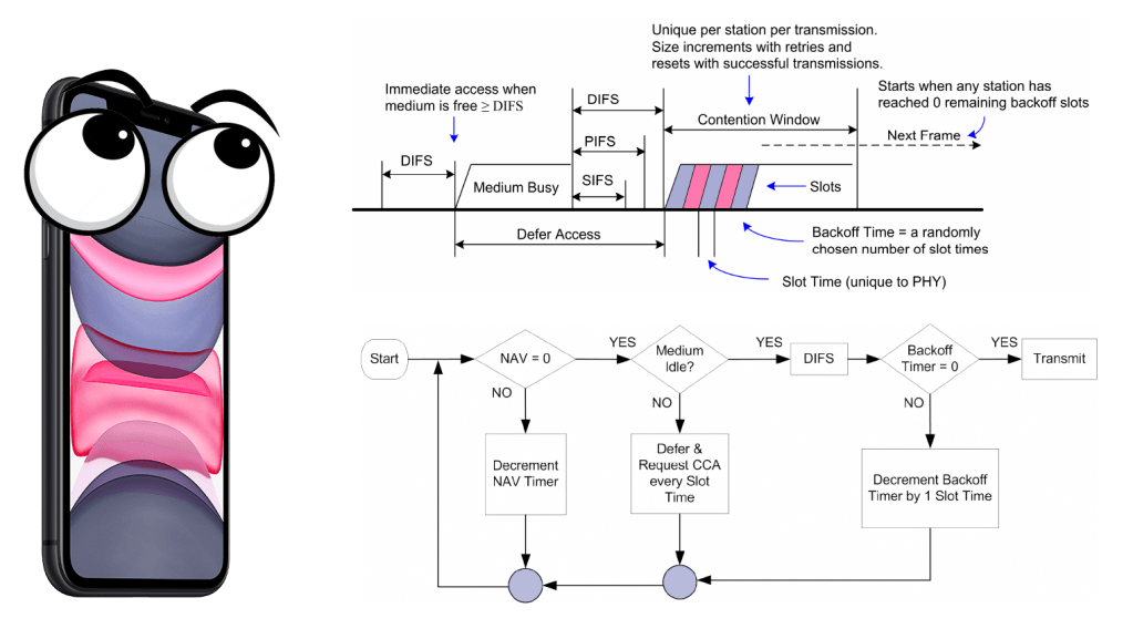First we we need to understand the different durations of a slot time, DIFS and SIFS. We also have for AIFS, EIFS and a few more. I will not go deeply into details about each interframe spacing, but rather just try to explain the graphic above. I recommend to read the PW0-270, PWO-205 or just read the standard.