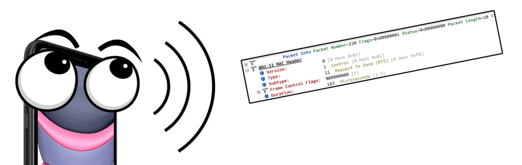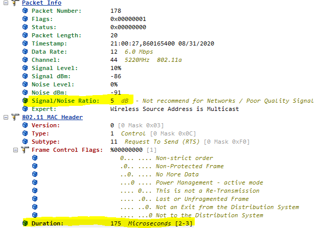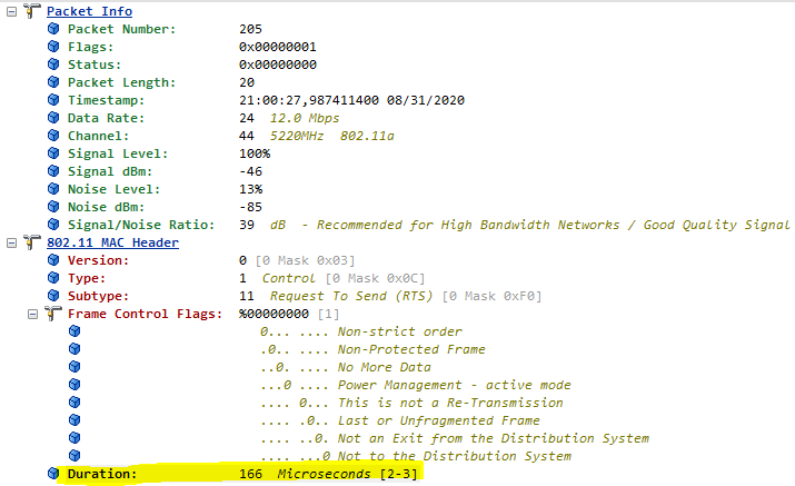 Next up is virtual carrier-sense, and this is provided by the MAC. This is also what we call the network allocation vector (NAV). The NAV maintans a prediction of future traffic based on the information that is announced in a RTS/CTS (IEEE-802.11-1999) frame for example. Below you can see a RTS frame, with a duration value of 166 Microseconds, and the next picture you see a RTS frame with only 5dB SNR that was captured correctly.