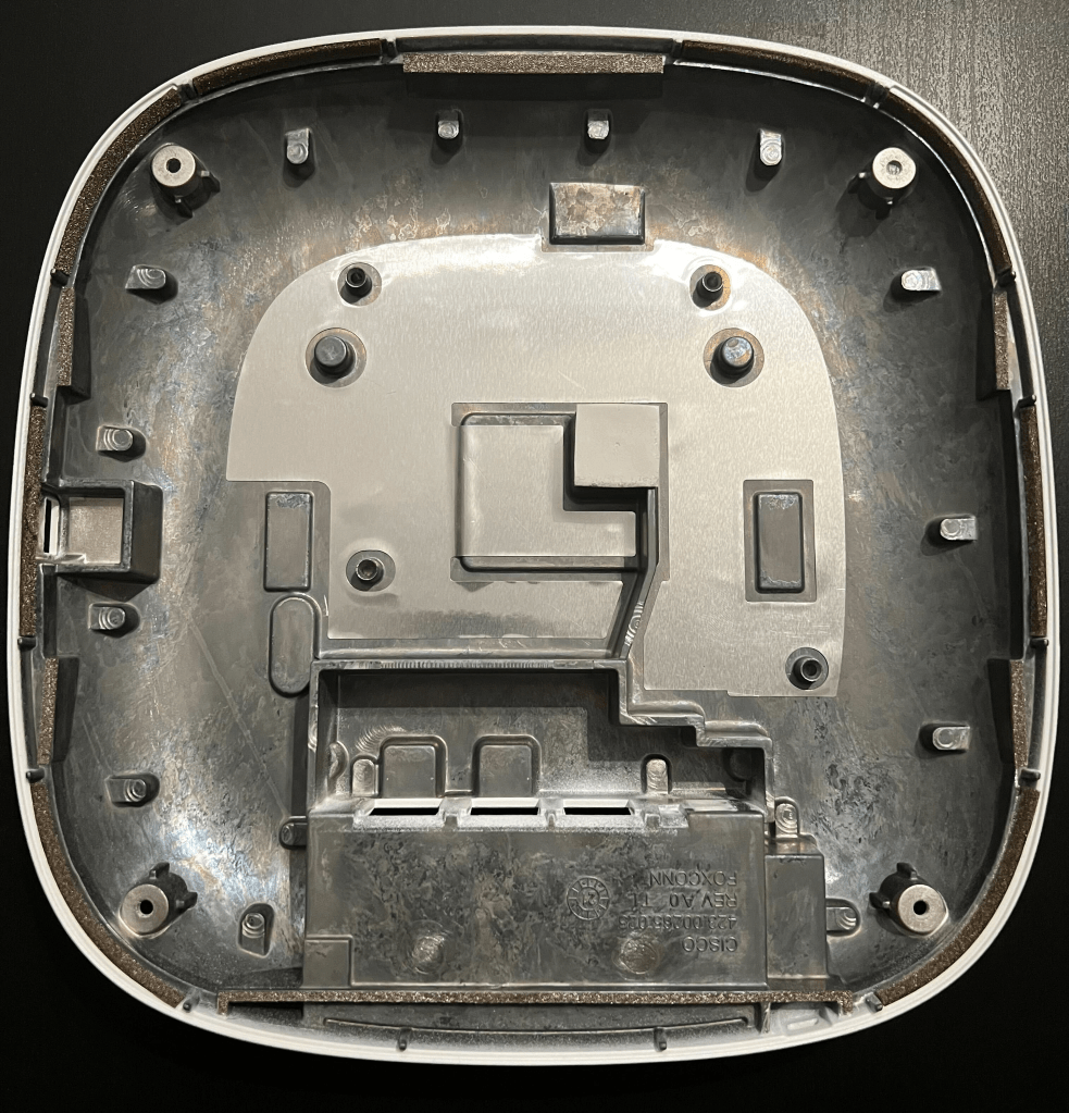 To give it a bit of context, this AP has a 4×4 2.4GHz radio, dual 4×4 5GHz Radio‘s (8×8 5GHz), 4×4 6GHz Radio, ZigBee, Bluetooth, environment sensors and a new CleanAir® chip. It also have dual 5|2.5|1Gbps ports and a USB port.