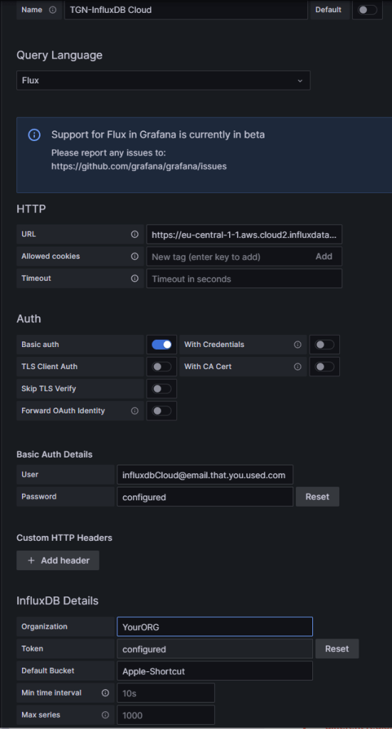 In «Basic Auth» you need to use the e-mail and password used in InfluxDB Cloud you registered, since the free version does not support additional users.