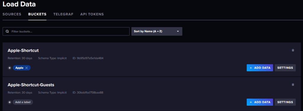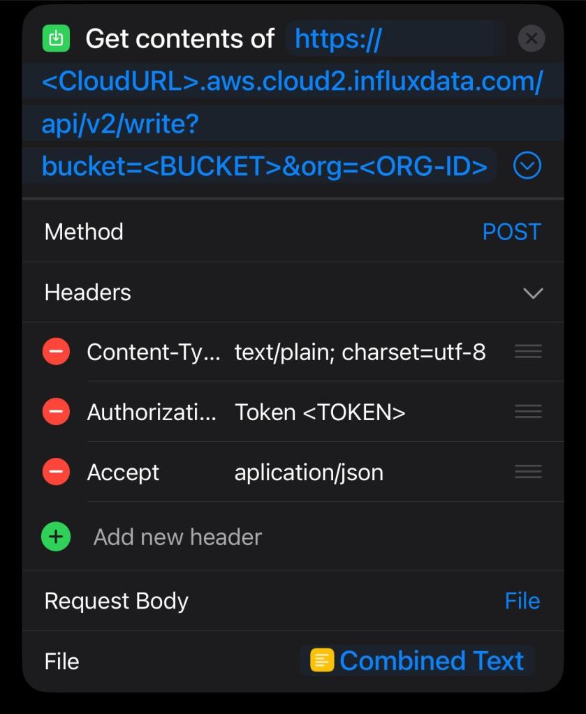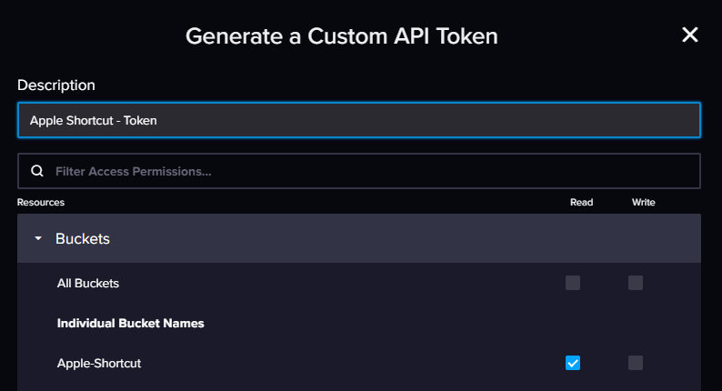 Create a write API for the Apple Shortcut so it can post data to the bucket and for Grafana you create a read API token.