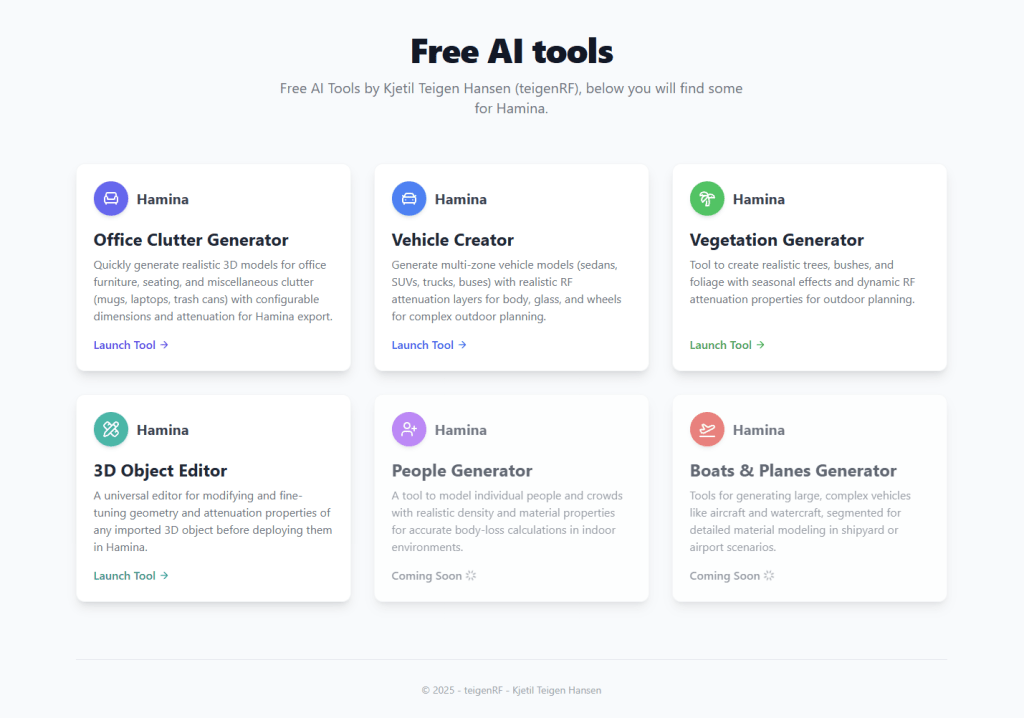 Find all my AI tools here https://ai-tools.teigenrf.org/, currently all is Hamina attenuation objects generators and editor tools – have fun!